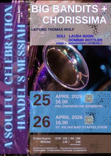 - A SOULFUL CELEBRATION HANDEL‘S MESSIAHGemeinsames Konzert des Gesangverein Gundelsheim e.V. und Musikverein Gundelsheim e.V. Zu hören sind Chorissima und Big Bandits unter der Leitung von Thomas Wolf.