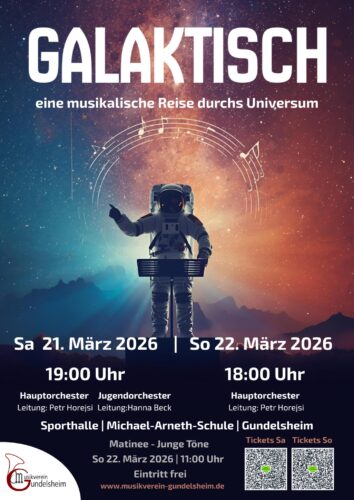 - GalaktischDer Musikverein Gundelsheim lädt im März 2026 zu zwei Abenden voller Atmosphäre, musikalischer Energie und inspirierender Klangwelten ein. Unter dem Motto „Galaktisch – eine musikalische Reise durchs Universum“ darf sich das Publikum auf ein eindrucksvolles Konzerterlebnis freuen, das die Faszination des … Galaktisch weiterlesen