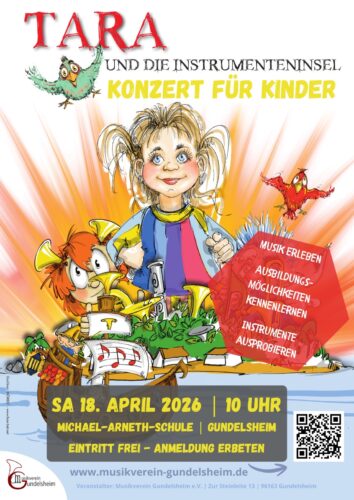 - Kinderkonzert: „TARA und die Instrumenteninsel“Am Samstag, 18. April 2026 um 10:00 Uhr verwandeln wir die Schulturnhalle in Gundelsheim in eine klingende Abenteuerwelt: Der Musikverein Gundelsheim führt das Kinderkonzertstück „TARA und die Instrumenteninsel“ auf.Gemeinsam mit Tara begeben sich die Kinder auf eine spannende Reise zu einer … Kinderkonzert: „TARA und die Instrumenteninsel“ weiterlesen