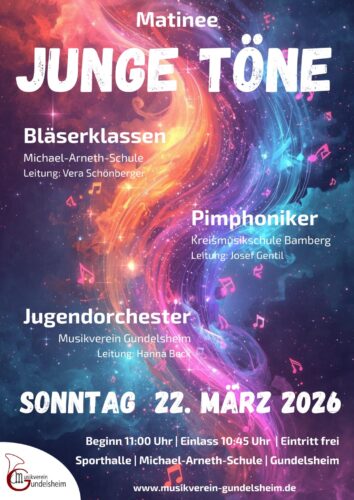 - Matinee „Junge Töne“Der Musikverein Gundelsheim lädt am Sonntag, 22. März 2026 zur Matinee „Junge Töne“ in die Schulturnhalle Gundelsheim ein. Der Musikverein Gundelsheim möchte mit dieser Veranstaltung ein Zeichen für die kontinuierliche Förderung junger Talente setzen und diesen eine Bühne bieten. Mitwirkende sind … Matinee „Junge Töne“ weiterlesen
