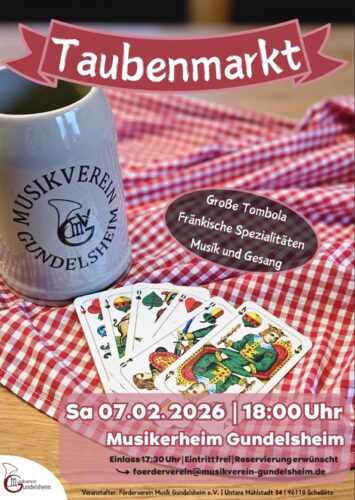 - Taubenmarkt 2026Der Förderverein Musik Gundelsheim e.V. lädt herzlich zum traditionellen Taubenmarkt ein! Freuen Sie sich auf einen geselligen Abend mit großer Tombola, fränkischen Spezialitäten sowie Musik und Gesang in gemütlicher Atmosphäre. 🗓 Samstag, 07. Februar 2026 🕕 Beginn: 18:00 Uhr (Einlass ab … Taubenmarkt 2026 weiterlesen