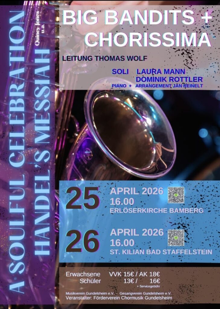 Gemeinsames Konzert des Gesangverein Gundelsheim e.V. und Musikverein Gundelsheim e.V. Zu hören sind Chorissima und Big Bandits unter der Leitung von Thomas Wolf.