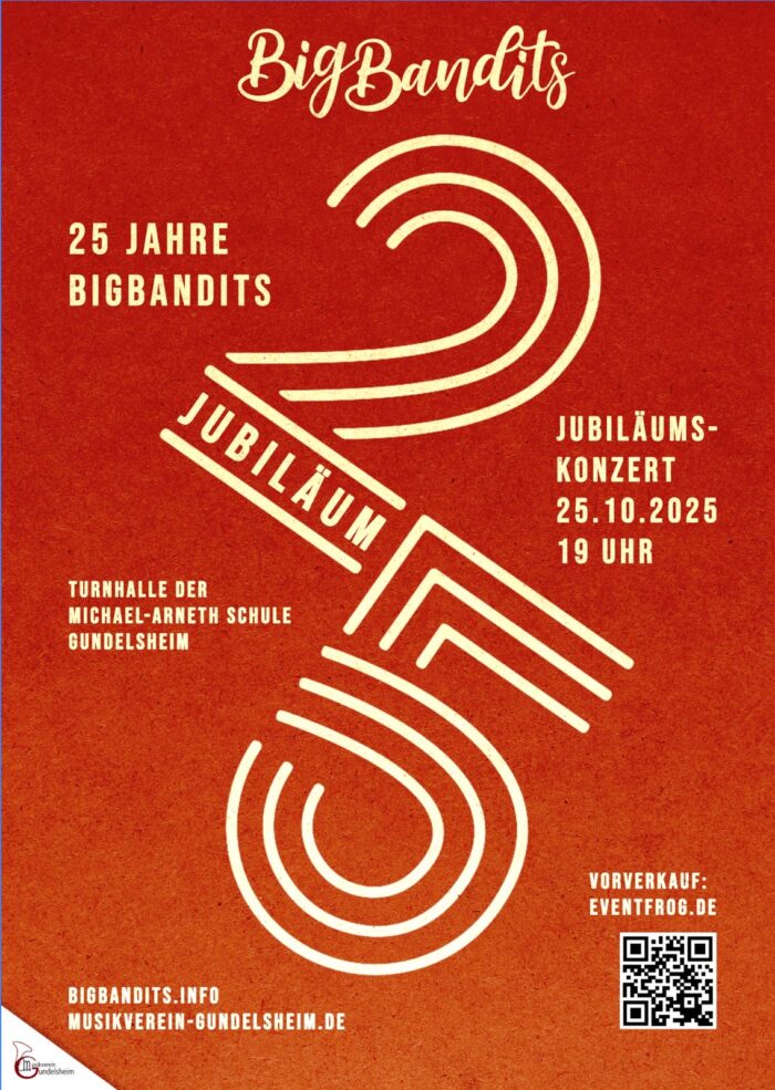Der Musikverein Gundelsheim e.V. lädt herzlich zum Jubiläumskonzert der Big Bandits ein, die in diesem Jahr ihr 25-jähriges Bestehen feiern. Das Konzert findet am Samstag, den 25. Oktober, um 19 Uhr in der Sporthalle der Michael-Arneth-Schule statt, Einlass ist ab 18 Uhr.